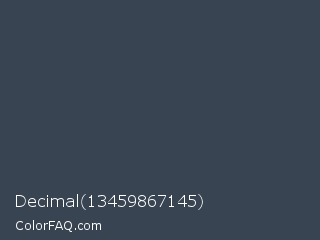 Decimal 13459867145 Color is a dark blue color and the nearest color is Charcoal #36454f. Hex code #384451 and RGB value is rgb(56,68,81). In RGB color space, this color is composed of 22% red, 27% green, 32% blue, In CMYK color space, this color is composed of 31% cyan, 16% magenta, 0% yellow , 68% black , In HSL color space, this color has a hue angle of 211° , 18% saturation and 27% lightness.