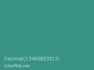 Decimal 13460833313 Color is a normal cyan color and the nearest color is Lochinvar #2c8c84. Hex code #399385 and RGB value is rgb(57,147,133). In RGB color space, this color is composed of 22% red, 58% green, 52% blue, In CMYK color space, this color is composed of 61% cyan, 0% magenta, 10% yellow , 42% black , In HSL color space, this color has a hue angle of 171° , 44% saturation and 40% lightness.