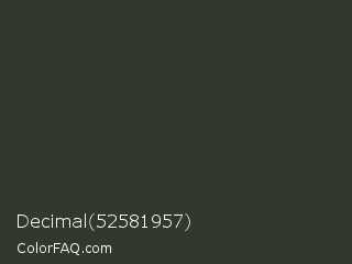 Decimal 52581957 Color is a very dark green color and the nearest color is Mine Shaft #323232. Hex code #31382d and RGB value is rgb(49,56,45). In RGB color space, this color is composed of 19% red, 22% green, 18% blue, In CMYK color space, this color is composed of 13% cyan, 0% magenta, 20% yellow , 78% black , In HSL color space, this color has a hue angle of 98° , 11% saturation and 20% lightness.