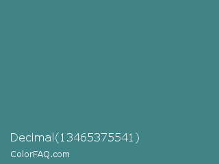 Decimal 13465375541 Color is a normal cyan color and the nearest color is Paradiso #317d82. Hex code #408487 and RGB value is rgb(64,132,135). In RGB color space, this color is composed of 25% red, 52% green, 53% blue, In CMYK color space, this color is composed of 53% cyan, 2% magenta, 0% yellow , 47% black , In HSL color space, this color has a hue angle of 183° , 36% saturation and 39% lightness.