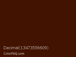 Decimal 13473556609 Color is a very dark orange color and the nearest color is Brown Pod #401801. Hex code #431301 and RGB value is rgb(67,19,1). In RGB color space, this color is composed of 26% red, 7% green, 0% blue, In CMYK color space, this color is composed of 0% cyan, 72% magenta, 99% yellow , 74% black , In HSL color space, this color has a hue angle of 16° , 97% saturation and 13% lightness.