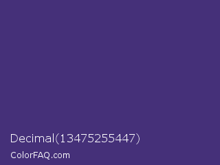 Decimal 13475255447 Color is a normal indigo color and the nearest color is Minsk #3f307f. Hex code #453079 and RGB value is rgb(69,48,121). In RGB color space, this color is composed of 27% red, 19% green, 47% blue, In CMYK color space, this color is composed of 43% cyan, 60% magenta, 0% yellow , 53% black , In HSL color space, this color has a hue angle of 257° , 43% saturation and 33% lightness.