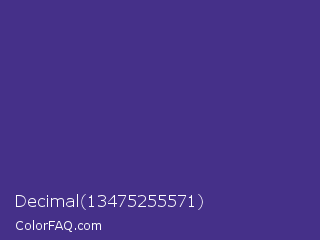 Decimal 13475255571 Color is a normal indigo color and the nearest color is Minsk #3f307f. Hex code #453089 and RGB value is rgb(69,48,137). In RGB color space, this color is composed of 27% red, 19% green, 54% blue, In CMYK color space, this color is composed of 50% cyan, 65% magenta, 0% yellow , 46% black , In HSL color space, this color has a hue angle of 254° , 48% saturation and 36% lightness.