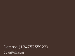 Decimal 13475255923 Color is a very dark orange color and the nearest color is Old Burgundy #43302e. Hex code #453129 and RGB value is rgb(69,49,41). In RGB color space, this color is composed of 27% red, 19% green, 16% blue, In CMYK color space, this color is composed of 0% cyan, 29% magenta, 41% yellow , 73% black , In HSL color space, this color has a hue angle of 17° , 25% saturation and 22% lightness.