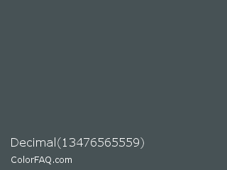 Decimal 13476565559 Color is a normal cyan color and the nearest color is Abbey #4c4f56. Hex code #475255 and RGB value is rgb(71,82,85). In RGB color space, this color is composed of 28% red, 32% green, 33% blue, In CMYK color space, this color is composed of 16% cyan, 4% magenta, 0% yellow , 67% black , In HSL color space, this color has a hue angle of 193° , 9% saturation and 31% lightness.