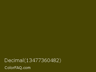 Decimal 13477360482 Color is a very dark yellow color and the nearest color is Bronze Olive #4e420c. Hex code #484502 and RGB value is rgb(72,69,2). In RGB color space, this color is composed of 28% red, 27% green, 1% blue, In CMYK color space, this color is composed of 0% cyan, 4% magenta, 97% yellow , 72% black , In HSL color space, this color has a hue angle of 57° , 95% saturation and 15% lightness.