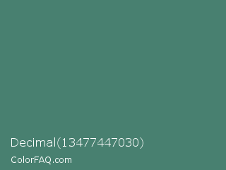 Decimal 13477447030 Color is a normal green color and the nearest color is Hookers Green #49796b. Hex code #488070 and RGB value is rgb(72,128,112). In RGB color space, this color is composed of 28% red, 50% green, 44% blue, In CMYK color space, this color is composed of 44% cyan, 0% magenta, 13% yellow , 50% black , In HSL color space, this color has a hue angle of 163° , 28% saturation and 39% lightness.