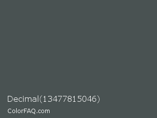Decimal 13477815046 Color is a dark cyan color and the nearest color is Abbey #4c4f56. Hex code #495252 and RGB value is rgb(73,82,82). In RGB color space, this color is composed of 29% red, 32% green, 32% blue, In CMYK color space, this color is composed of 11% cyan, 0% magenta, 0% yellow , 68% black , In HSL color space, this color has a hue angle of 180° , 6% saturation and 30% lightness.
