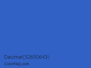 Decimal 52650643 Color is a normal blue color and the nearest color is Mariner #286acd. Hex code #3161c5 and RGB value is rgb(49,97,197). In RGB color space, this color is composed of 19% red, 38% green, 77% blue, In CMYK color space, this color is composed of 75% cyan, 51% magenta, 0% yellow , 23% black , In HSL color space, this color has a hue angle of 221° , 60% saturation and 48% lightness.