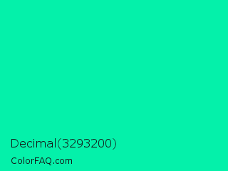 Decimal 3293200 Color is a normal green color and the nearest color is Medium Spring Green #00fa9a. Hex code #04f1aa and RGB value is rgb(4,241,170). In RGB color space, this color is composed of 2% red, 95% green, 67% blue, In CMYK color space, this color is composed of 98% cyan, 0% magenta, 29% yellow , 5% black , In HSL color space, this color has a hue angle of 162° , 97% saturation and 48% lightness.