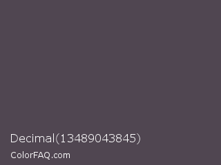 Decimal 13489043845 Color is a dark magenta color and the nearest color is Mortar #504351. Hex code #504651 and RGB value is rgb(80,70,81). In RGB color space, this color is composed of 31% red, 27% green, 32% blue, In CMYK color space, this color is composed of 1% cyan, 14% magenta, 0% yellow , 68% black , In HSL color space, this color has a hue angle of 295° , 7% saturation and 30% lightness.