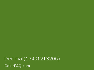 Decimal 13491213206 Color is a normal green color and the nearest color is Sap Green #507d2a. Hex code #538024 and RGB value is rgb(83,128,36). In RGB color space, this color is composed of 33% red, 50% green, 14% blue, In CMYK color space, this color is composed of 35% cyan, 0% magenta, 72% yellow , 50% black , In HSL color space, this color has a hue angle of 89° , 56% saturation and 32% lightness.