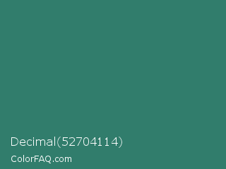 Decimal 52704114 Color is a normal cyan color and the nearest color is Myrtle Green #317873. Hex code #317d6c and RGB value is rgb(49,125,108). In RGB color space, this color is composed of 19% red, 49% green, 42% blue, In CMYK color space, this color is composed of 61% cyan, 0% magenta, 14% yellow , 51% black , In HSL color space, this color has a hue angle of 167° , 44% saturation and 34% lightness.