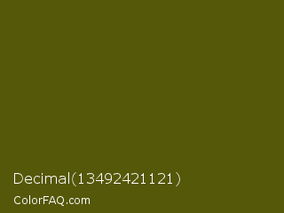 Decimal 13492421121 Color is a very dark yellow color and the nearest color is Saratoga #555b10. Hex code #555809 and RGB value is rgb(85,88,9). In RGB color space, this color is composed of 33% red, 35% green, 4% blue, In CMYK color space, this color is composed of 3% cyan, 0% magenta, 90% yellow , 65% black , In HSL color space, this color has a hue angle of 62° , 81% saturation and 19% lightness.