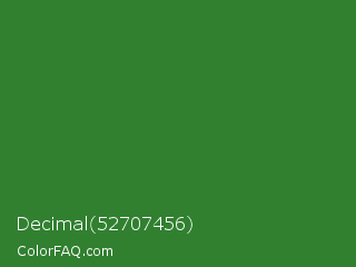 Decimal 52707456 Color is a normal green color and the nearest color is Forest Green #228b22. Hex code #318030 and RGB value is rgb(49,128,48). In RGB color space, this color is composed of 19% red, 50% green, 19% blue, In CMYK color space, this color is composed of 62% cyan, 0% magenta, 63% yellow , 50% black , In HSL color space, this color has a hue angle of 119° , 45% saturation and 35% lightness.