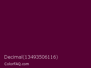 Decimal 13493506116 Color is a very dark magenta color and the nearest color is Mulberry Wood #5c0536. Hex code #570134 and RGB value is rgb(87,1,52). In RGB color space, this color is composed of 34% red, 0% green, 20% blue, In CMYK color space, this color is composed of 0% cyan, 99% magenta, 40% yellow , 66% black , In HSL color space, this color has a hue angle of 324° , 98% saturation and 17% lightness.