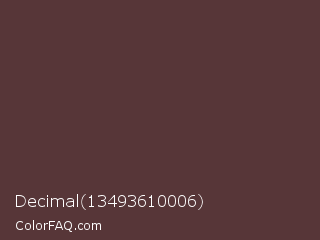 Decimal 13493610006 Color is a dark red color and the nearest color is Congo Brown #593737. Hex code #573638 and RGB value is rgb(87,54,56). In RGB color space, this color is composed of 34% red, 21% green, 22% blue, In CMYK color space, this color is composed of 0% cyan, 38% magenta, 36% yellow , 66% black , In HSL color space, this color has a hue angle of 356° , 23% saturation and 28% lightness.