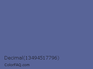 Decimal 13494517796 Color is a normal blue color and the nearest color is UCLA Blue #536895. Hex code #586498 and RGB value is rgb(88,100,152). In RGB color space, this color is composed of 35% red, 39% green, 60% blue, In CMYK color space, this color is composed of 42% cyan, 34% magenta, 0% yellow , 40% black , In HSL color space, this color has a hue angle of 229° , 27% saturation and 47% lightness.