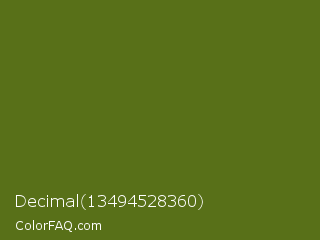 Decimal 13494528360 Color is a dark lime color and the nearest color is Fern Frond #657220. Hex code #587018 and RGB value is rgb(88,112,24). In RGB color space, this color is composed of 35% red, 44% green, 9% blue, In CMYK color space, this color is composed of 21% cyan, 0% magenta, 79% yellow , 56% black , In HSL color space, this color has a hue angle of 76° , 65% saturation and 27% lightness.