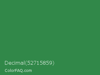 Decimal 52715859 Color is a normal green color and the nearest color is Sea Green #2e8b57. Hex code #318849 and RGB value is rgb(49,136,73). In RGB color space, this color is composed of 19% red, 53% green, 29% blue, In CMYK color space, this color is composed of 64% cyan, 0% magenta, 46% yellow , 47% black , In HSL color space, this color has a hue angle of 137° , 47% saturation and 36% lightness.