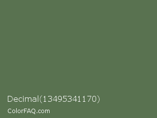 Decimal 13495341170 Color is a normal green color and the nearest color is Cactus #587156. Hex code #597250 and RGB value is rgb(89,114,80). In RGB color space, this color is composed of 35% red, 45% green, 31% blue, In CMYK color space, this color is composed of 22% cyan, 0% magenta, 30% yellow , 55% black , In HSL color space, this color has a hue angle of 104° , 18% saturation and 38% lightness.