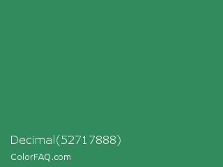 Decimal 52717888 Color is a normal green color and the nearest color is Sea Green #2e8b57. Hex code #318b5c and RGB value is rgb(49,139,92). In RGB color space, this color is composed of 19% red, 55% green, 36% blue, In CMYK color space, this color is composed of 65% cyan, 0% magenta, 34% yellow , 45% black , In HSL color space, this color has a hue angle of 149° , 48% saturation and 37% lightness.