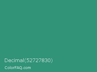 Decimal 52727830 Color is a normal green color and the nearest color is Illuminating Emerald #319177. Hex code #319378 and RGB value is rgb(49,147,120). In RGB color space, this color is composed of 19% red, 58% green, 47% blue, In CMYK color space, this color is composed of 67% cyan, 0% magenta, 18% yellow , 42% black , In HSL color space, this color has a hue angle of 163° , 50% saturation and 38% lightness.