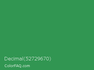 Decimal 52729670 Color is a normal green color and the nearest color is Sea Green #2e8b57. Hex code #319652 and RGB value is rgb(49,150,82). In RGB color space, this color is composed of 19% red, 59% green, 32% blue, In CMYK color space, this color is composed of 67% cyan, 0% magenta, 45% yellow , 41% black , In HSL color space, this color has a hue angle of 140° , 51% saturation and 39% lightness.