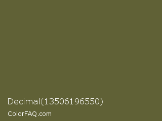 Decimal 13506196550 Color is a dark yellow color and the nearest color is Verdigris #5d5e37. Hex code #606136 and RGB value is rgb(96,97,54). In RGB color space, this color is composed of 38% red, 38% green, 21% blue, In CMYK color space, this color is composed of 1% cyan, 0% magenta, 44% yellow , 62% black , In HSL color space, this color has a hue angle of 61° , 28% saturation and 30% lightness.