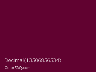 Decimal 13506856534 Color is a very dark rose color and the nearest color is Black Rose #67032d. Hex code #610230 and RGB value is rgb(97,2,48). In RGB color space, this color is composed of 38% red, 1% green, 19% blue, In CMYK color space, this color is composed of 0% cyan, 98% magenta, 51% yellow , 62% black , In HSL color space, this color has a hue angle of 331° , 96% saturation and 19% lightness.