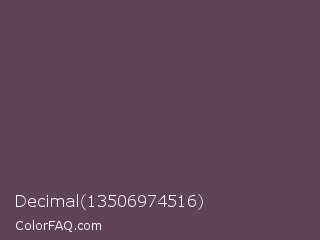 Decimal 13506974516 Color is a normal magenta color and the nearest color is Eggplant #614051. Hex code #614356 and RGB value is rgb(97,67,86). In RGB color space, this color is composed of 38% red, 26% green, 34% blue, In CMYK color space, this color is composed of 0% cyan, 31% magenta, 11% yellow , 62% black , In HSL color space, this color has a hue angle of 322° , 18% saturation and 32% lightness.