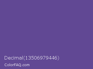 Decimal 13506979446 Color is a normal indigo color and the nearest color is Butterfly Bush #624e9a. Hex code #614894 and RGB value is rgb(97,72,148). In RGB color space, this color is composed of 38% red, 28% green, 58% blue, In CMYK color space, this color is composed of 34% cyan, 51% magenta, 0% yellow , 42% black , In HSL color space, this color has a hue angle of 260° , 35% saturation and 43% lightness.