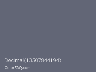 Decimal 13507844194 Color is a normal blue color and the nearest color is Shuttle Gray #5f6672. Hex code #626676 and RGB value is rgb(98,102,118). In RGB color space, this color is composed of 38% red, 40% green, 46% blue, In CMYK color space, this color is composed of 17% cyan, 14% magenta, 0% yellow , 54% black , In HSL color space, this color has a hue angle of 228° , 9% saturation and 42% lightness.