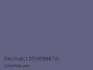 Decimal 13509088870 Color is a normal indigo color and the nearest color is Dolphin #646077. Hex code #646182 and RGB value is rgb(100,97,130). In RGB color space, this color is composed of 39% red, 38% green, 51% blue, In CMYK color space, this color is composed of 23% cyan, 25% magenta, 0% yellow , 49% black , In HSL color space, this color has a hue angle of 245° , 15% saturation and 45% lightness.