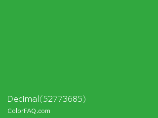Decimal 52773685 Color is a normal green color and the nearest color is Wageningen Green #34b233. Hex code #31a83f and RGB value is rgb(49,168,63). In RGB color space, this color is composed of 19% red, 66% green, 25% blue, In CMYK color space, this color is composed of 71% cyan, 0% magenta, 63% yellow , 34% black , In HSL color space, this color has a hue angle of 127° , 55% saturation and 43% lightness.