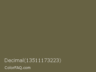 Decimal 13511173223 Color is a normal yellow color and the nearest color is Finch #626649. Hex code #676243 and RGB value is rgb(103,98,67). In RGB color space, this color is composed of 40% red, 38% green, 26% blue, In CMYK color space, this color is composed of 0% cyan, 5% magenta, 35% yellow , 60% black , In HSL color space, this color has a hue angle of 52° , 21% saturation and 33% lightness.