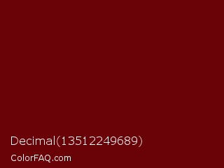 Decimal 13512249689 Color is a very dark red color and the nearest color is Rosewood #65000b. Hex code #690307 and RGB value is rgb(105,3,7). In RGB color space, this color is composed of 41% red, 1% green, 3% blue, In CMYK color space, this color is composed of 0% cyan, 97% magenta, 93% yellow , 59% black , In HSL color space, this color has a hue angle of 358° , 94% saturation and 21% lightness.