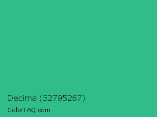 Decimal 52795267 Color is a normal green color and the nearest color is Mountain Meadow #30ba8f. Hex code #31bd87 and RGB value is rgb(49,189,135). In RGB color space, this color is composed of 19% red, 74% green, 53% blue, In CMYK color space, this color is composed of 74% cyan, 0% magenta, 29% yellow , 26% black , In HSL color space, this color has a hue angle of 157° , 59% saturation and 47% lightness.