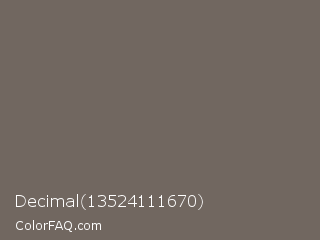 Decimal 13524111670 Color is a normal orange color and the nearest color is Flint #6f6a61. Hex code #716760 and RGB value is rgb(113,103,96). In RGB color space, this color is composed of 44% red, 40% green, 38% blue, In CMYK color space, this color is composed of 0% cyan, 9% magenta, 15% yellow , 56% black , In HSL color space, this color has a hue angle of 25° , 8% saturation and 41% lightness.