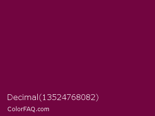 Decimal 13524768082 Color is a dark rose color and the nearest color is Siren #7a013a. Hex code #720540 and RGB value is rgb(114,5,64). In RGB color space, this color is composed of 45% red, 2% green, 25% blue, In CMYK color space, this color is composed of 0% cyan, 96% magenta, 44% yellow , 55% black , In HSL color space, this color has a hue angle of 328° , 92% saturation and 23% lightness.