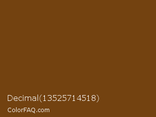 Decimal 13525714518 Color is a dark orange color and the nearest color is Sepia #704214. Hex code #734210 and RGB value is rgb(115,66,16). In RGB color space, this color is composed of 45% red, 26% green, 6% blue, In CMYK color space, this color is composed of 0% cyan, 43% magenta, 86% yellow , 55% black , In HSL color space, this color has a hue angle of 30° , 76% saturation and 26% lightness.