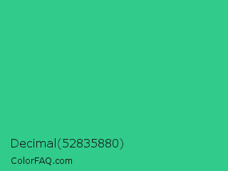 Decimal 52835880 Color is a normal green color and the nearest color is Shamrock #33cc99. Hex code #31cc8c and RGB value is rgb(49,204,140). In RGB color space, this color is composed of 19% red, 80% green, 55% blue, In CMYK color space, this color is composed of 76% cyan, 0% magenta, 31% yellow , 20% black , In HSL color space, this color has a hue angle of 155° , 61% saturation and 50% lightness.