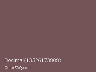 Decimal 13526173808 Color is a normal red color and the nearest color is Russett #755a57. Hex code #745456 and RGB value is rgb(116,84,86). In RGB color space, this color is composed of 45% red, 33% green, 34% blue, In CMYK color space, this color is composed of 0% cyan, 28% magenta, 26% yellow , 55% black , In HSL color space, this color has a hue angle of 356° , 16% saturation and 39% lightness.