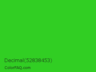 Decimal 52838453 Color is a normal green color and the nearest color is Lime Green #32cd32. Hex code #31ce23 and RGB value is rgb(49,206,35). In RGB color space, this color is composed of 19% red, 81% green, 14% blue, In CMYK color space, this color is composed of 76% cyan, 0% magenta, 83% yellow , 19% black , In HSL color space, this color has a hue angle of 115° , 71% saturation and 47% lightness.