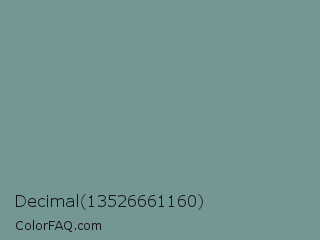 Decimal 13526661160 Color is a normal cyan color and the nearest color is Juniper #6d9292. Hex code #749694 and RGB value is rgb(116,150,148). In RGB color space, this color is composed of 45% red, 59% green, 58% blue, In CMYK color space, this color is composed of 23% cyan, 0% magenta, 1% yellow , 41% black , In HSL color space, this color has a hue angle of 176° , 14% saturation and 52% lightness.