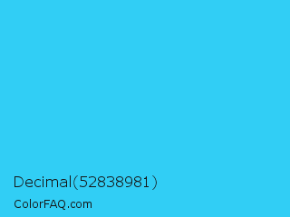Decimal 52838981 Color is a normal cyan color and the nearest color is Scooter #2ebfd4. Hex code #31cef5 and RGB value is rgb(49,206,245). In RGB color space, this color is composed of 19% red, 81% green, 96% blue, In CMYK color space, this color is composed of 80% cyan, 16% magenta, 0% yellow , 4% black , In HSL color space, this color has a hue angle of 192° , 91% saturation and 58% lightness.