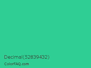 Decimal 52839432 Color is a normal green color and the nearest color is Shamrock #33cc99. Hex code #31cf98 and RGB value is rgb(49,207,152). In RGB color space, this color is composed of 19% red, 81% green, 60% blue, In CMYK color space, this color is composed of 76% cyan, 0% magenta, 27% yellow , 19% black , In HSL color space, this color has a hue angle of 159° , 62% saturation and 50% lightness.