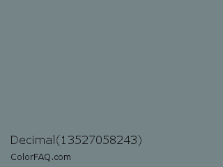 Decimal 13527058243 Color is a normal cyan color and the nearest color is Blue Smoke #748881. Hex code #758487 and RGB value is rgb(117,132,135). In RGB color space, this color is composed of 46% red, 52% green, 53% blue, In CMYK color space, this color is composed of 13% cyan, 2% magenta, 0% yellow , 47% black , In HSL color space, this color has a hue angle of 190° , 7% saturation and 49% lightness.