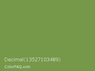 Decimal 13527103489 Color is a normal green color and the nearest color is Palm Leaf #6f9940. Hex code #759849 and RGB value is rgb(117,152,73). In RGB color space, this color is composed of 46% red, 60% green, 29% blue, In CMYK color space, this color is composed of 23% cyan, 0% magenta, 52% yellow , 40% black , In HSL color space, this color has a hue angle of 87° , 35% saturation and 44% lightness.