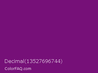 Decimal 13527696744 Color is a dark magenta color and the nearest color is Patriarch #800080. Hex code #761078 and RGB value is rgb(118,16,120). In RGB color space, this color is composed of 46% red, 6% green, 47% blue, In CMYK color space, this color is composed of 2% cyan, 87% magenta, 0% yellow , 53% black , In HSL color space, this color has a hue angle of 299° , 76% saturation and 27% lightness.
